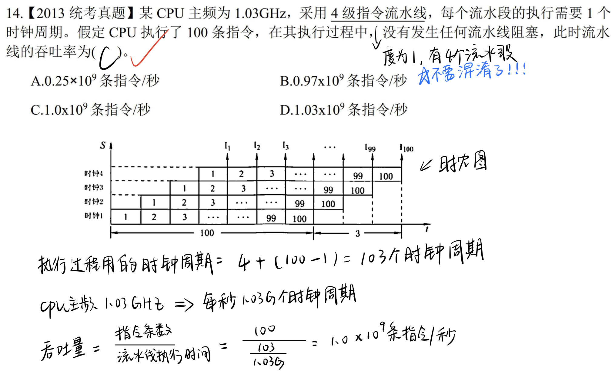 - 设用时最长的流水段用时X秒(如200ns),总执行时间为Y秒(如700ns),系统有N条指令,度为1