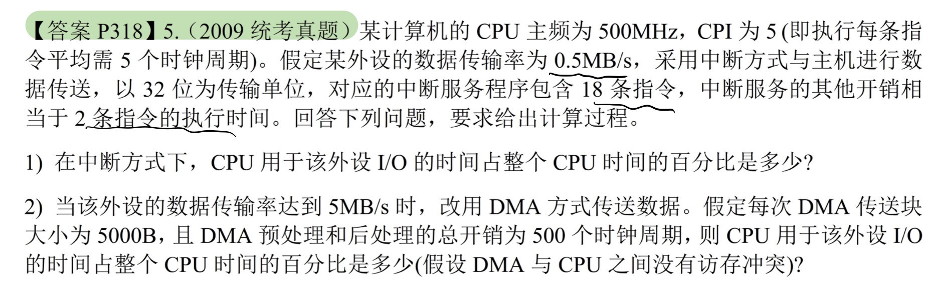 CPU每次用于数据传送的时钟周期 = $5\times18 + 5\times2$ = 100个时钟周期