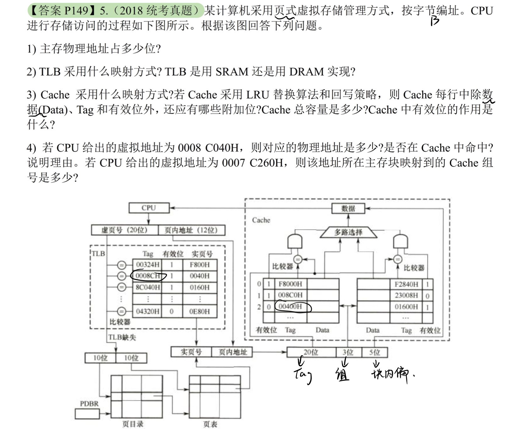 虚页号为0000 0010 0100B,TLB标记为0000 0010 010B = 012H,组号为0