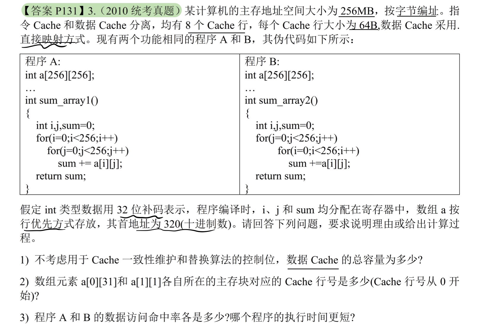 每个字块存16个int数型,A的命中率 = $\frac{15}{16} = 93.7%$,B的命中率 = 0,A更快