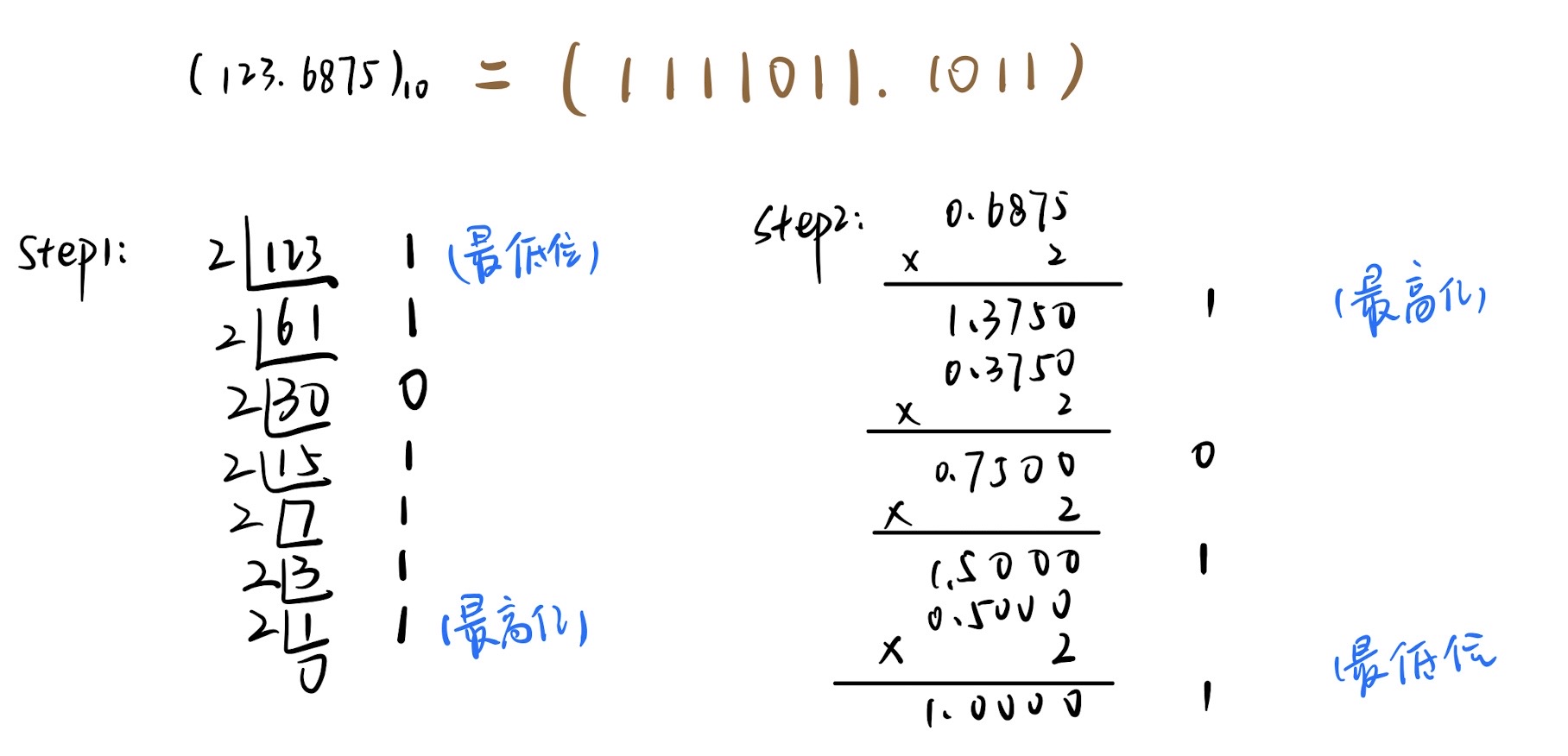 - 规格化:规定尾数的最高数位必须是一个有效值(1)
