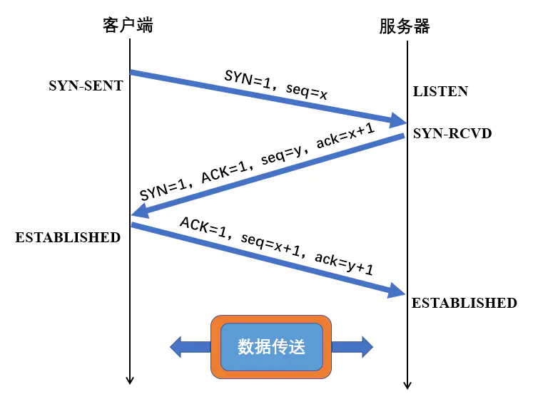 - 报文中ACK=1,确认好seq = y+1,自己序号seq = x+1