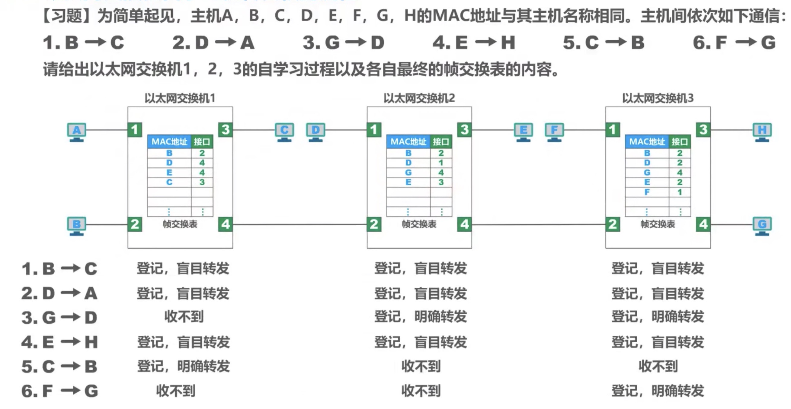 - 随着网络各主机间的通信,以太网交换机通过自学习算法自动逐渐建立起帧交换表