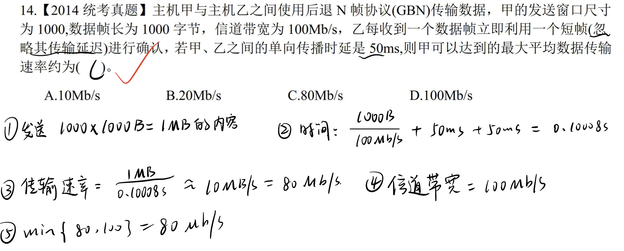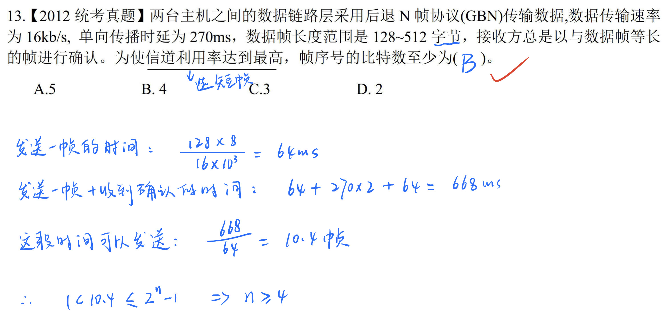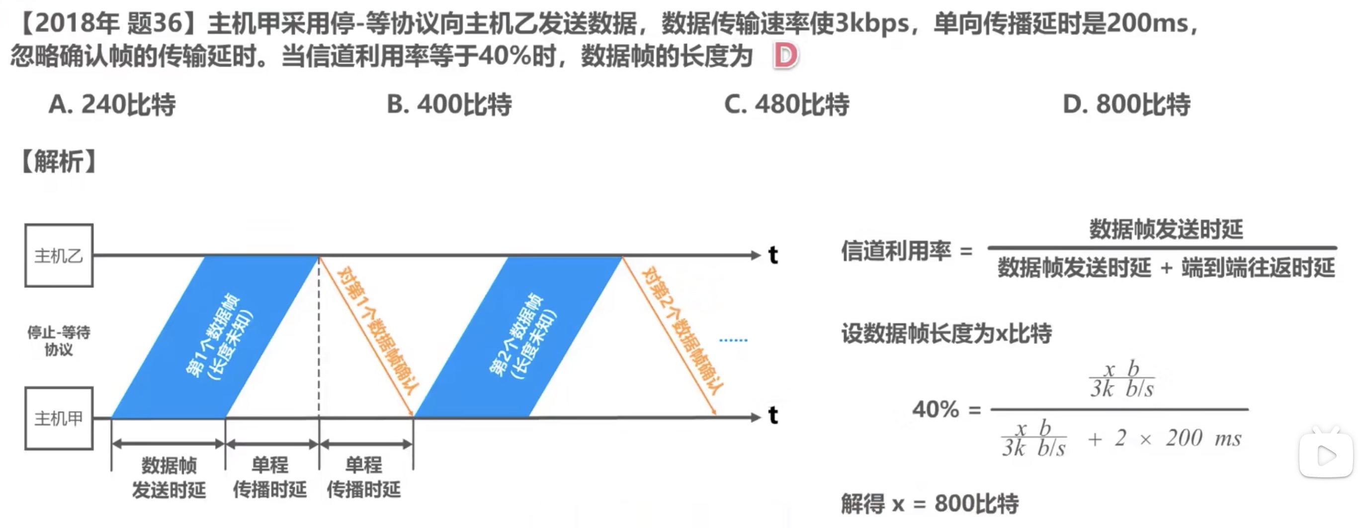 - 当往返时延RTT远大于数据帧发送时延TD时【如卫星链路】,信道利用率非常低