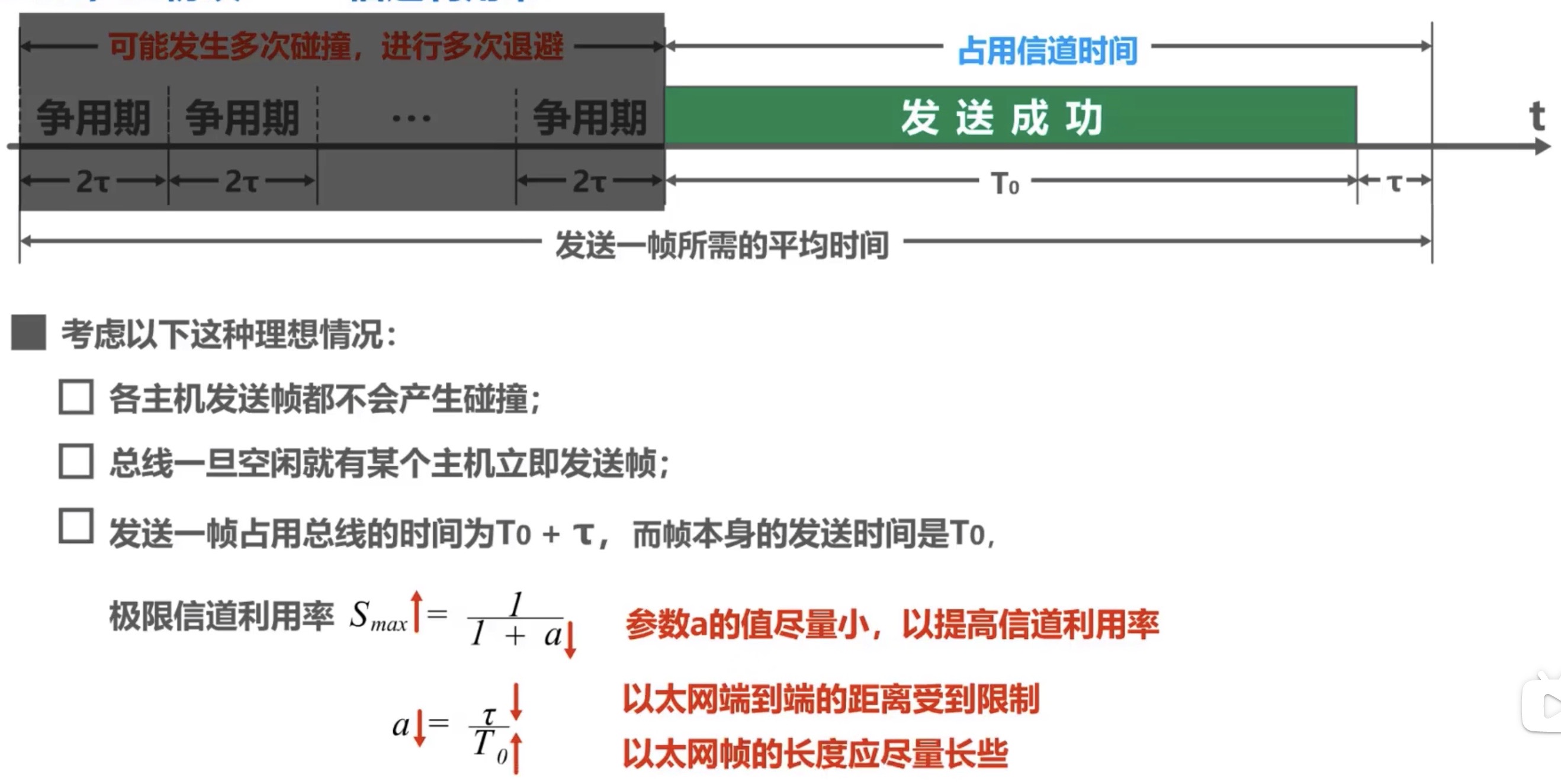 - 信号传播延迟趋于0时,信道利用率接近100%