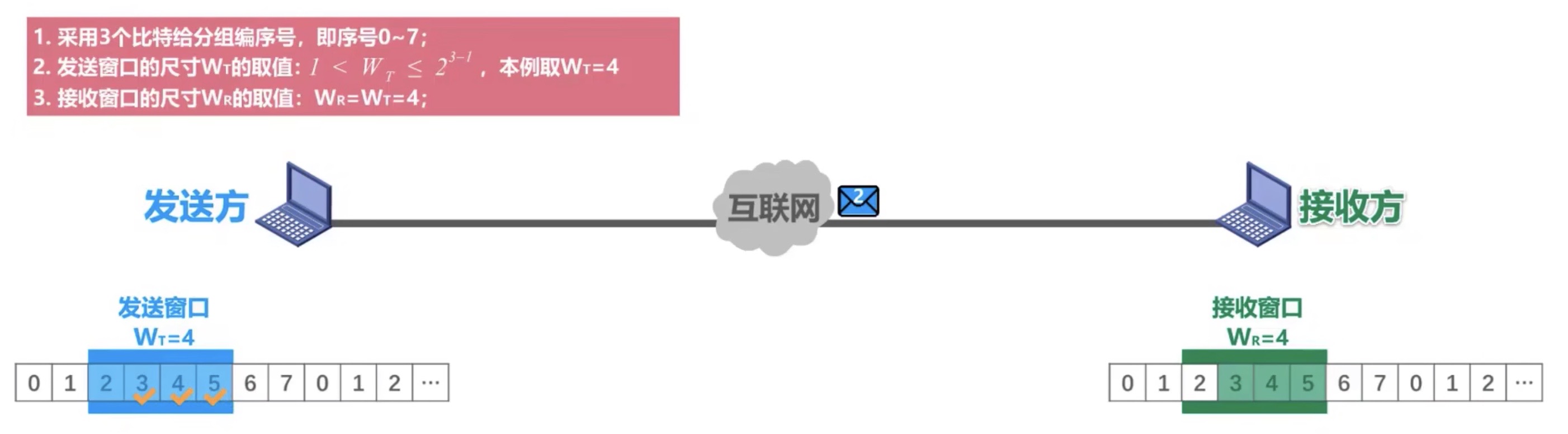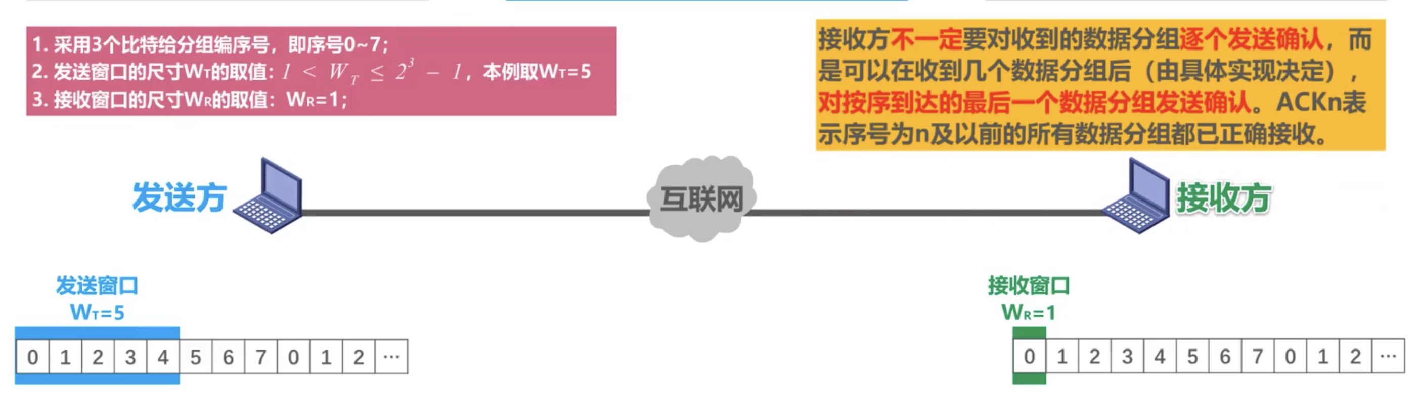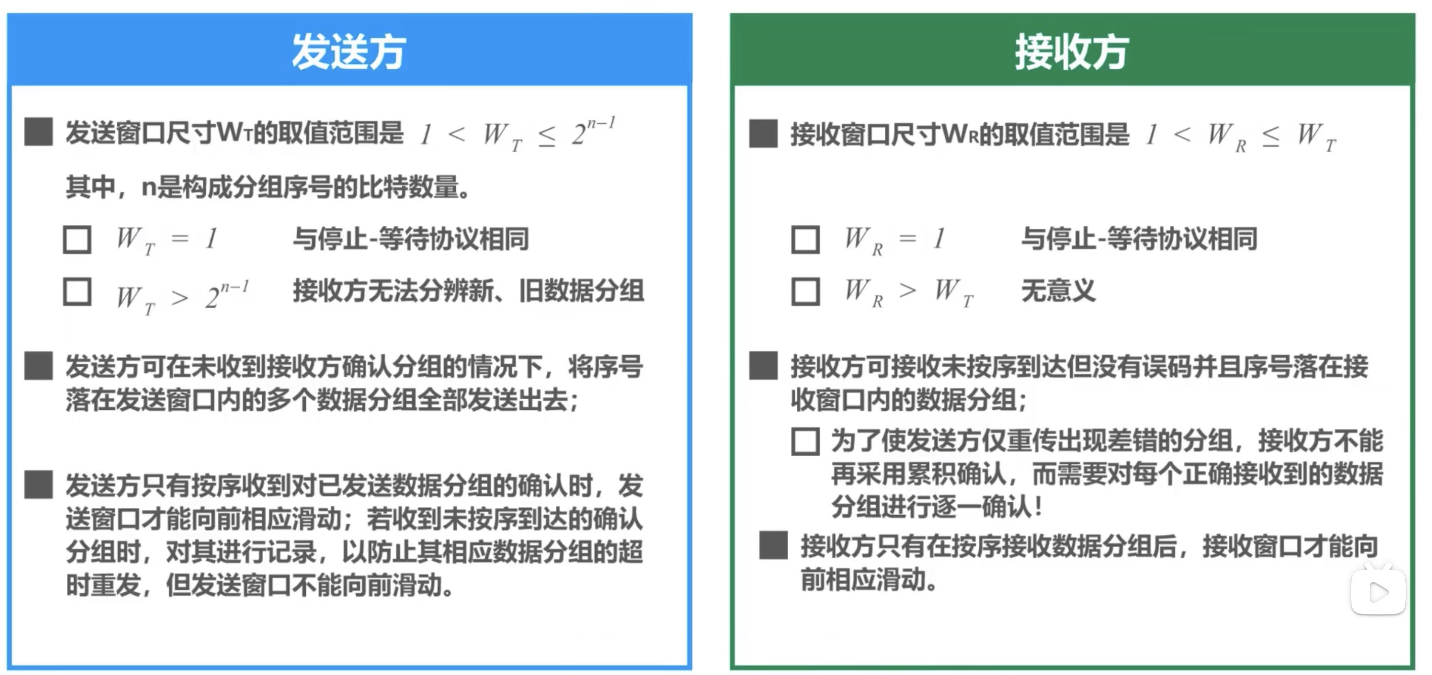 SR协议 | 1<发送窗口$\leq2^n-1$;1<接受窗口$\leq$发送窗口 |