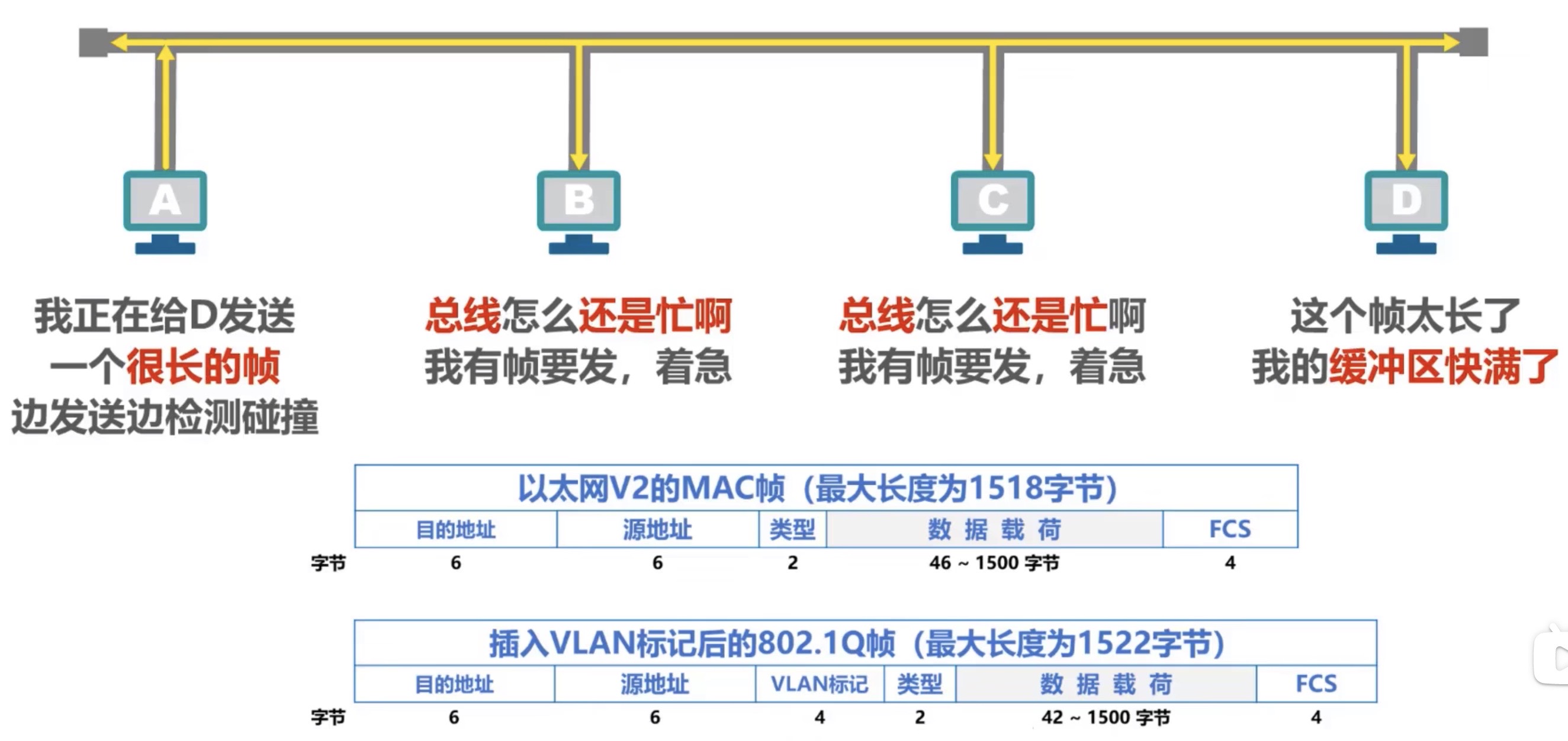 - 考虑差错控制等多种因素,每种数据链路层协议都规定了帧的数据部分的长度上限,即最大传送单元MTU