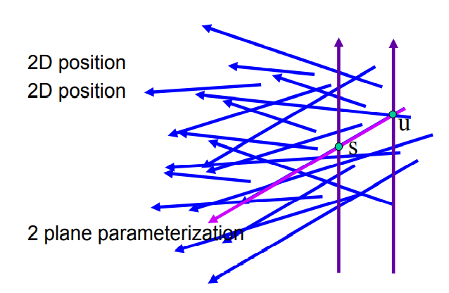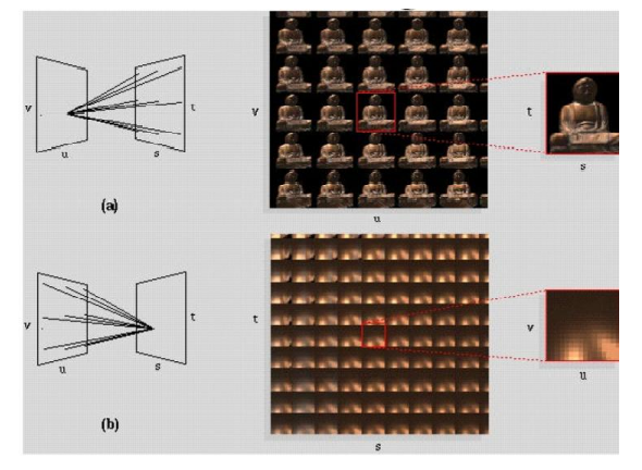 很多摄像机从某一个角度看向世界,拍一张图,然后将所有图都组织到一块,就是整个光场。如下图,斯坦福做了一个摄像机的矩阵,相当于在不同的位置对场景拍不同的图,每个位置对应一个u、v,拍到的照片是s、t,相机本身二维,成像结果二维,综合为四维