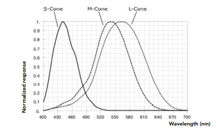 三种不同的细胞自然会感应出三种颜色,对应下图的S、M、L