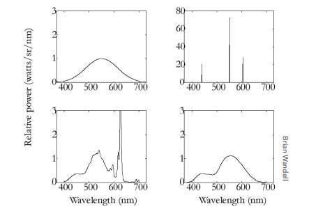 用一种光照亮能记录光强度的东西能够得到右边的另一种分布;两种光同时照亮得到的分布就是它们两个对应的SPD之和