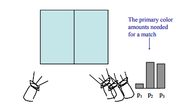 如下图,给定任何一个颜色,希望用三种不同颜色混合匹配得到相同颜色