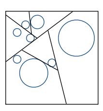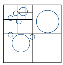 将整个场景包围在盒中,再将包围盒切分为8份(三维情况下,每面四块),下图展示的是二维下的情况,将整个盒子分为四块,再将每块都分成四块,直到每个格子中无物体或物体数量足够少
