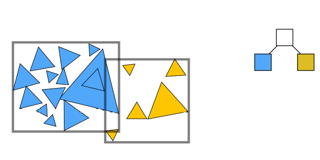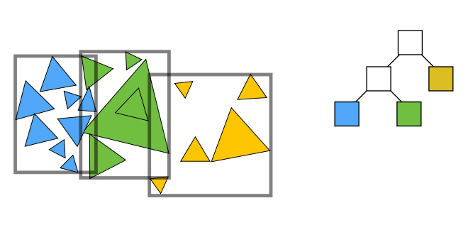 - 基于包围盒中的物体,递归地拆分包围盒为两个部份