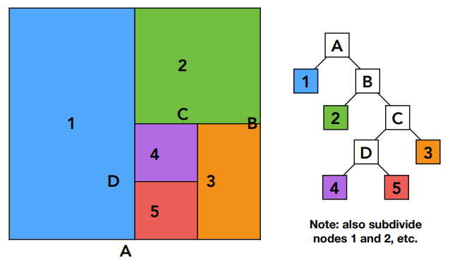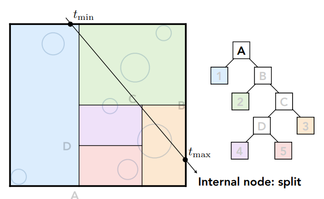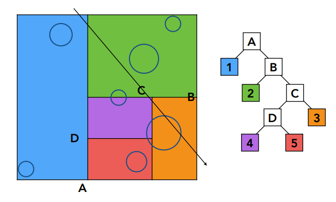 如果一个空间已经被划分成了KD-Tree结构,则中间节点(A,B,C,D)只需要记录被划分成的各自格子,叶子节点则存储和格子相交的几何形体
