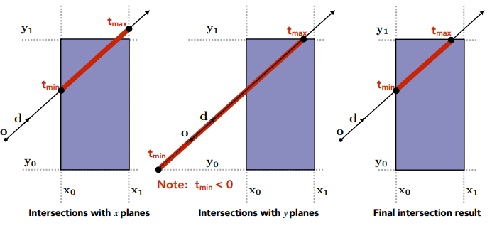 如上图所示,我们分别计算射线与包围盒两个边界的相交时间点,求取到$t_{min}/t_{max}$的交集