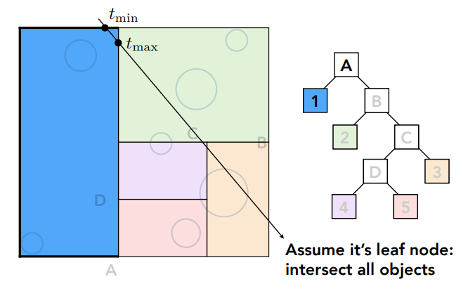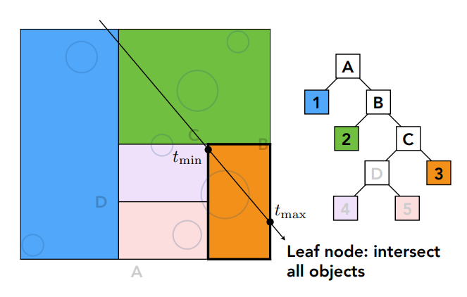 - 节点本身为叶子节点,此时光线与叶子节点里所有物体求交,放回最近交点