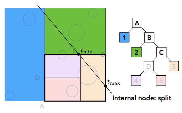 - 叶子节点中三角形数量满足终止条件时停止划分,记录实际的物体至叶子节点里,其余结构用于判断加速结构