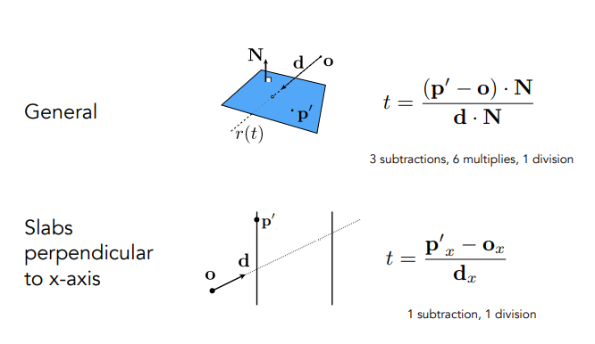 - 射线只有同时进入所有对平面才算进入包围盒,离开包围盒同理