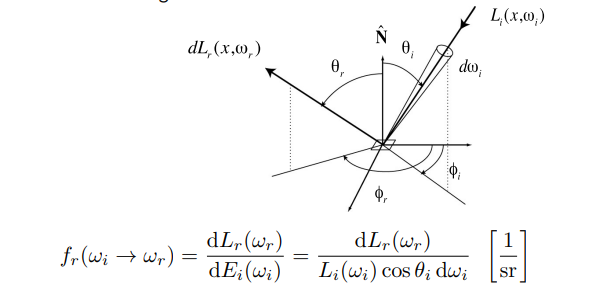 出于描述dA从某个方向接收到能量后向某一方向辐射的能量值的目的,我们定义了双向反射分布函数(BRDF)
