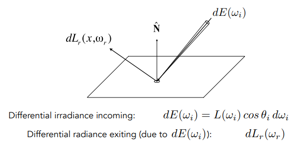 从某个立体角($\omega$)来的Radiance会打在dA上,在dA上转换成能量,并以光的形式辐射到另一个方向上去(dLr),即表现为出去的Radiance