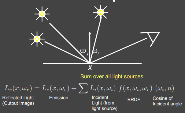 在某个方向看向一点时,我们不知道看到的能量(Lr)、从其他反射到这一点的Radiance,但其他项都已知,可定义物体的不同材质(diffuse、gloss、specular)