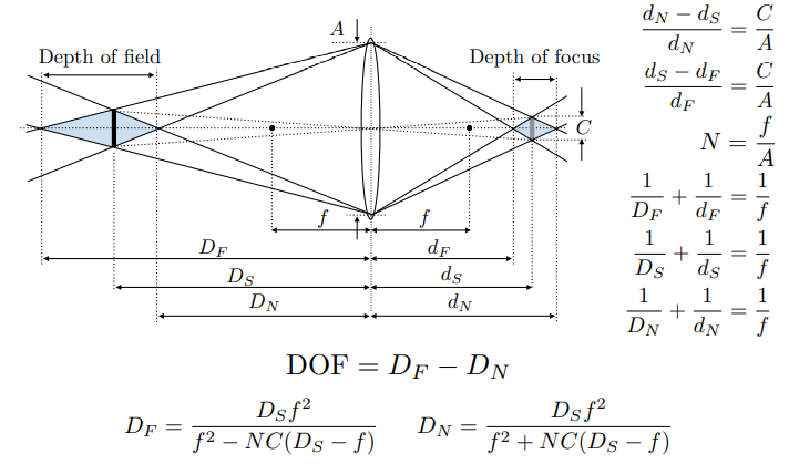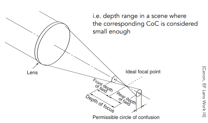 景深:实际场景中有一段深度,该深度经透镜后会在成像平面附近形成一段区域,区域内认为CoC是足够小的