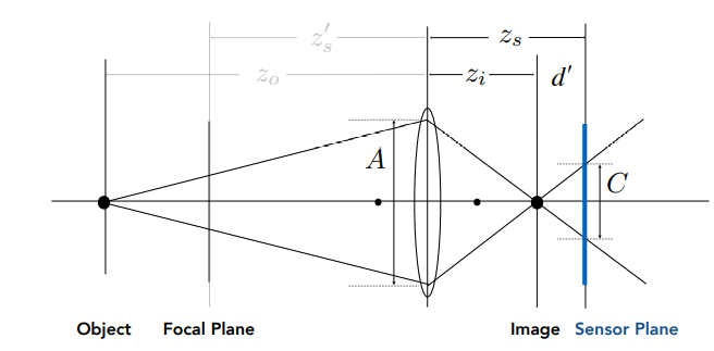 任何地方有一个点,它穿过透镜后,可以根据上面透镜的公式算出像距,但是如果成像平面不在这个地方,而是离得有一段距离,光线就会在原本成像的地方之后继续传播,那被感光元件接收到的时候就不再是一个点了,而是变成了一个圆(CoC)