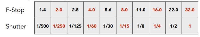 快门的时间打开得短就会暗,那就可以提高光圈的大小,用更小的F数。以下的表格上下对应的参数基本可以达到相同的曝光度。但达到的效果并不会一模一样(因为大光圈会引起前景深的问题,快门时间又会引起运动模糊)