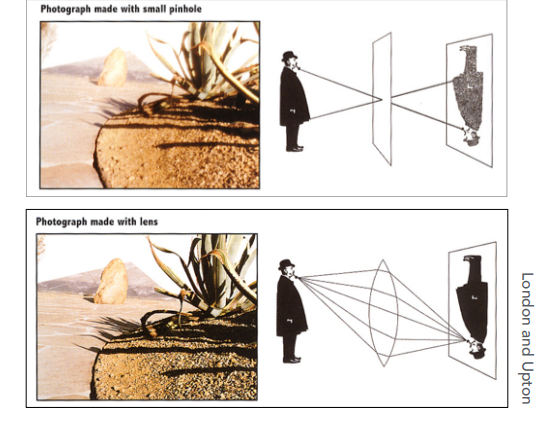 如果一个相机没有透镜或针孔是无法拍出照片的,如果将一个感光元件直接放在一个人的面前,任何一个点上都可能收集到来自不同方向的光,而这个点作为传感器无法区分来自各个方向的光线,此时会将各个方向的能量都综合在这个点上,会导致所有东西都是模糊的