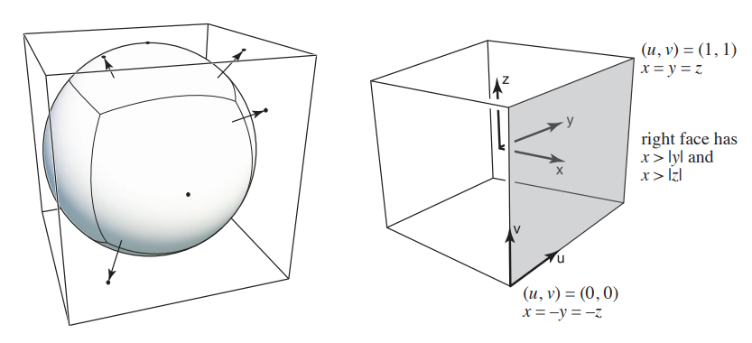 立方体贴图则由球体上一个向量沿自身方向映射到立方体上的点获得