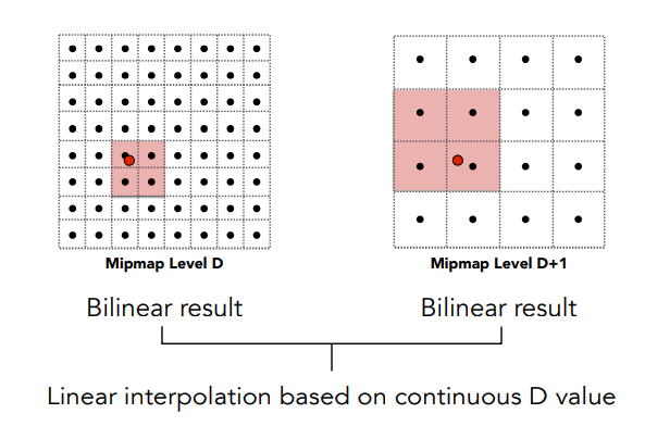 在使用时往往D值会四舍五入为整数,这会导致纹理的不连续,因此,我们还需要进行下图所示的Trilinear Interpolation 从而得到一个连续的D值