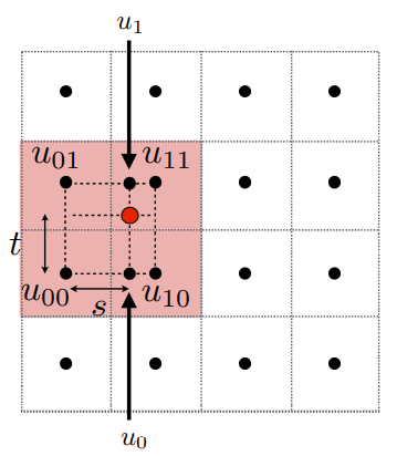 计算两个辅助值 $$u_0 = lerp(s,u_{00},u_{10})$$ $$u_1 = lerp(s,u_{01},u_{11})$$