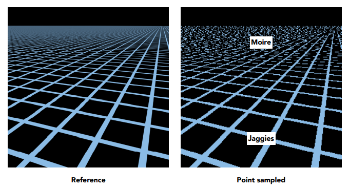 此时在点采样下会产生摩尔纹和锯齿,如下图