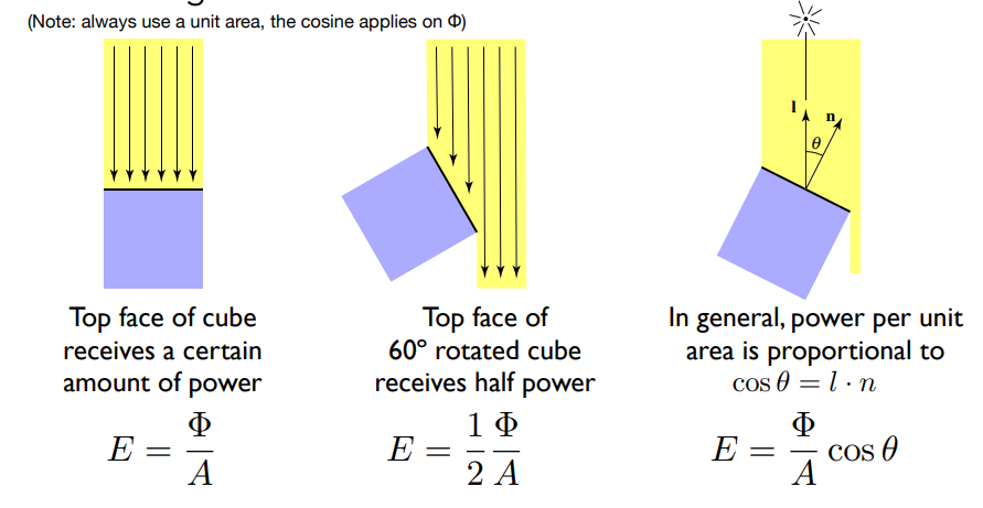 例如Lambert's Cosine Law中平行光打到单位面上如果垂直则可以接收到6根光线,平面若倾斜则只能接收到三个光线,接收到的能量要乘以$\cos \theta$