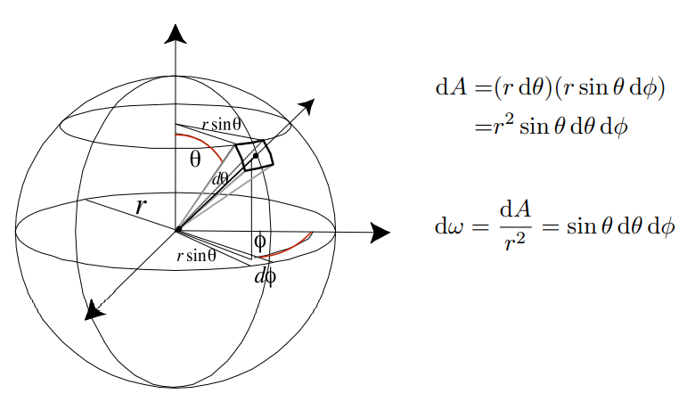 微分立体角:球面上当立体角的方向与Z轴的夹角($\theta$)、绕着Z轴旋转的角($\phi$)发生改变时,会在对应方向的球面上框出一片区域,该区域对应的立体角即为微分立体角