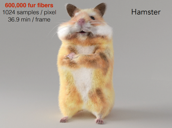 下图中的仓鼠,由60万根毛发组成,在每像素中有1024个采样点的采样率下,每帧需要渲染36.9分钟