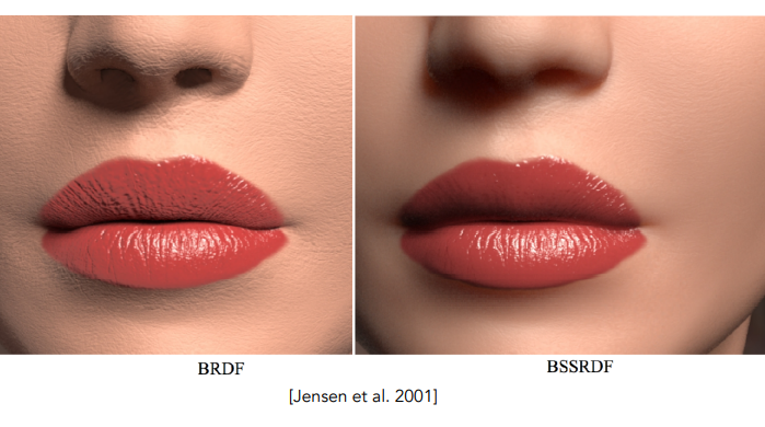 如图,BRDF渲染的皮肤效果显得干燥,BSSRDF则能有很好的效果