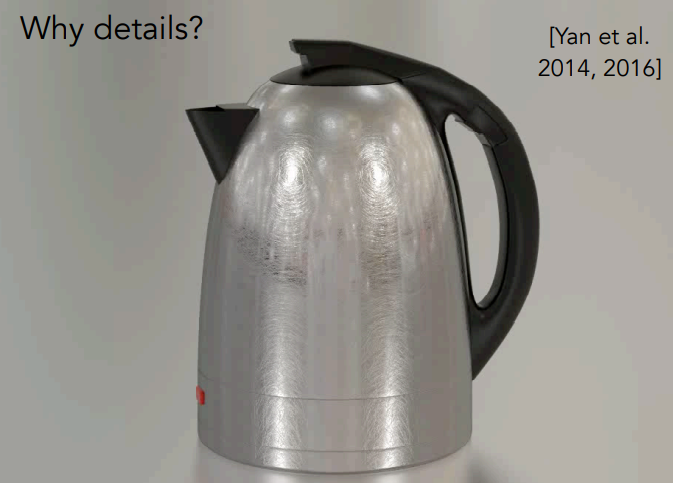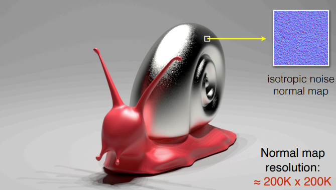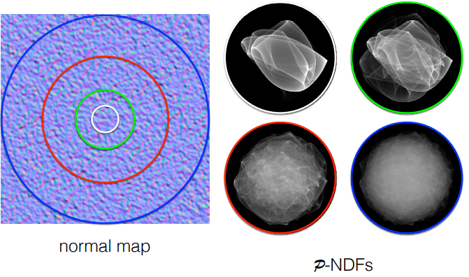 如果考虑像素覆盖的范围,就可以得到各种各样神奇的法线分布(NDF)。可以想象一个像素覆盖了非常多的微表面,那这些微表面自然会显示出一些统计学的规律,那如果覆盖的范围小,就会显示出一些很独特的性质,法线分布就会看上去很有特点