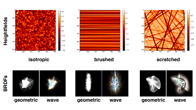 波动光学得出的BRDF与几何光学的BRDF很像但具有不连续的特点(光会发生干涉,会引起部分区域加强或减弱)