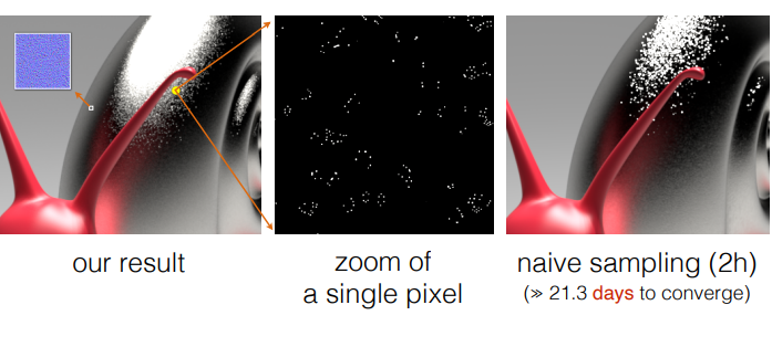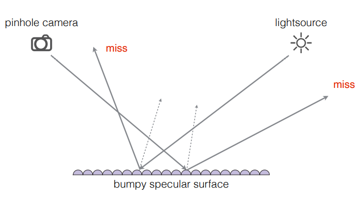 认为每一个微表面是一个镜面,如下图场景中有一个针孔摄像机和一个点光源,那从摄像机打根光线过去,打到哪个表面,就可以知道它的法线,也就可以知道它的镜面反射方向,所以也就很难通过反射的方式让光线打到光源上。从光源打过来也是同理,打到一个微表面,并且知道如何反射,但就是反射不到摄像机上去