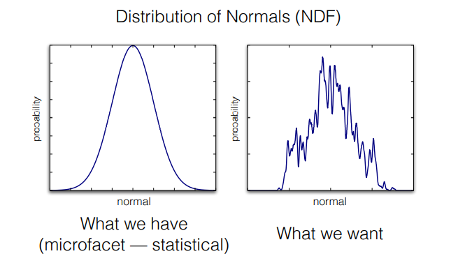微表面模型中重要的是微表面的法线分布,描述分布时,往往使用非常简单的模型(正态分布、高斯),得到的自然是没有什么细节的结果(法线分布没有体现各种各样的变化和细节)