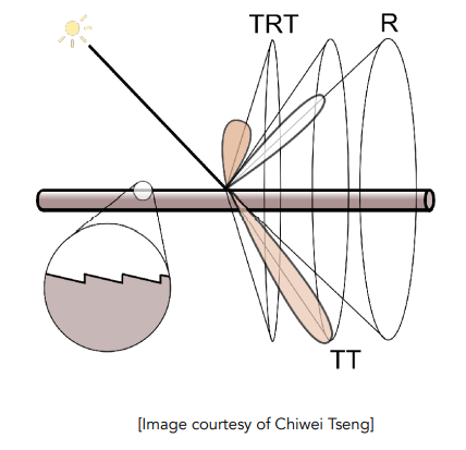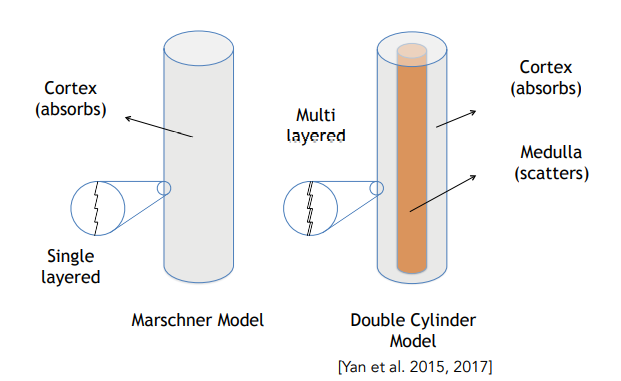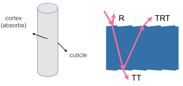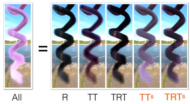 光线在打到表面后依旧会发生反射,穿过结构后也可能无法到达髓质或是到达后没有发生反射,与Marschner Model中一样,存在R、TT、TRT