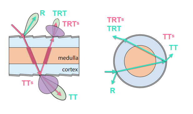 同样会有部分光穿过髓质的时候发散到各个方向上去(TTs),TRT也相同,在穿过髓质的过程中,两次都有可能被散射,形成TRTs