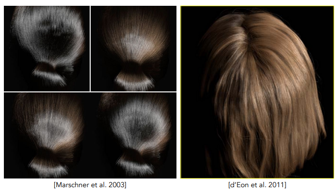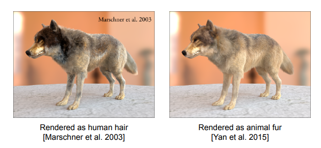 人的毛发计算模型往往不能用于动物毛发计算,如下图,左侧为人的毛发模型计算结果,可见其不足以描述光线与动物毛发的相互作用