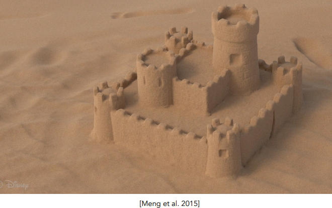 比如一个沙子城堡,每一单元上由不同石子构成,各自成分占比也可得出,渲染结果在离得近的时候可以看到一粒一粒的,离得远的情况下就会是一个沙丘