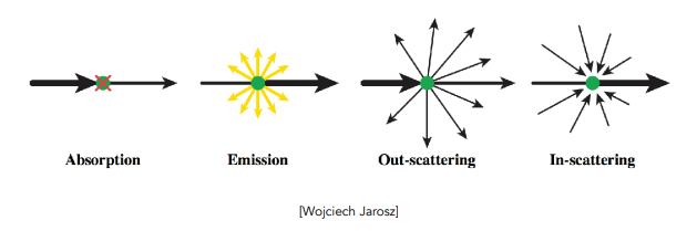 光线在散射介质内部能传播多远是有这个介质的吸收能力决定,当传播停止后再考虑光线的反射方向,与光在物体表面的弹射类似,只是中间的任何一个点都有可能会发生方向的改变。但始终会找到一个path,在将弹射点和光源相连,计算整个路径的贡献(不考虑Rendering equation,因为渲染方程描述物体表面与物体的作用而非体积间的相互作用)