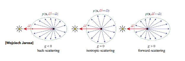 类比与物体表面,物体为diffuse的才会认为光线被均匀地反射到各个不同的方向上去,散射介质也是相同,任何一点都会发生散射,使用Phase Function(相位函数)定义散射计算