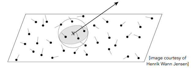 局部密度估计是建立在上面的观察上的,一开始打了很多光子,光子分布在物体表面了,从相机出发的一堆光线也打到物体表面上了,那我们看到的物体表面,光子分布越集中的地方就越亮,越不集中就越不亮,当第二趟打到各种不同的物体表面的时候就要做一个局部的密度估计