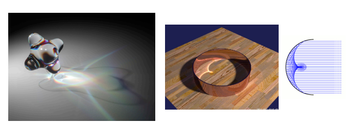 Caustics是光线经过聚焦打在游泳池底,然后被人眼看见。光线要穿过水的表面(凹凸不平,还有浪),会被聚焦到一系列的地方(水面有办法将光线聚焦到一系列的线上)。这种情况渲染起来非常困难,因为假设游泳池底是diffuse的,光线会先经过一个specular的水面,游泳池底被我们看见也要经过一个specular(这种路径简称SDS(specular-diffuse-specular))