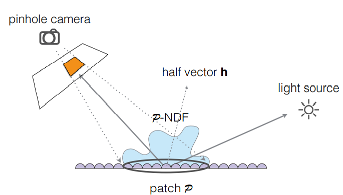 认为每一个微表面是一个镜面,如下图场景中有一个针孔摄像机和一个点光源,那从摄像机打根光线过去,打到哪个表面,就可以知道它的法线,也就可以知道它的镜面反射方向,所以也就很难通过反射的方式让光线打到光源上。从光源打过来也是同理,打到一个微表面,并且知道如何反射,但就是反射不到摄像机上去